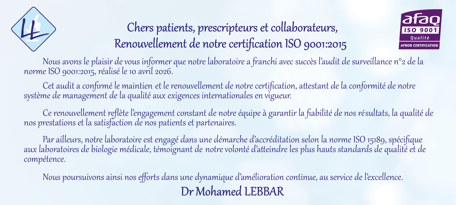 Dans le cadre de notre engagement pour l’excellence, nous avons mis en place un système de management de la qualité conforme au référentiel international ISO 9001:2015, garantissant le respect des exigences réglementaires et déontologiques, notamment celles du GBEA (Guide de Bonne Exécution des Analyses). Notre ambition est d’aller encore plus loin en poursuivant notre démarche d’accréditation selon la norme ISO 15189, renforçant ainsi la compétence technique et la fiabilité de nos résultats.